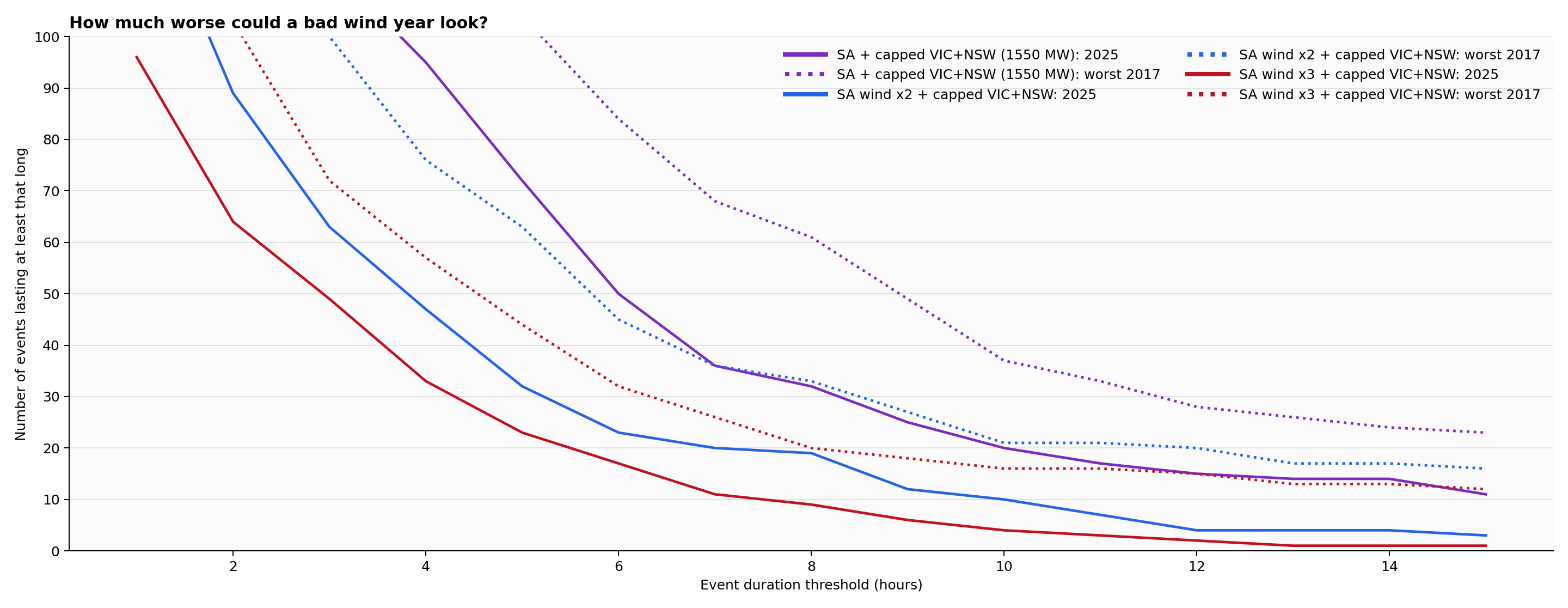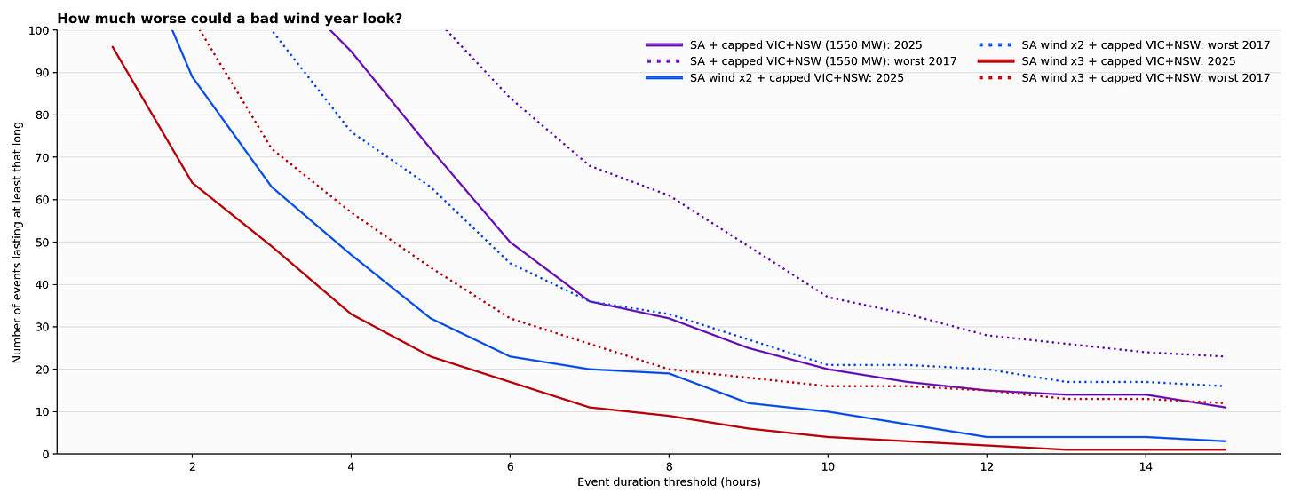 In the stronger eastern-support case, the number of 8-hour-plus shortfall runs rises from roughly thirty in 2025 to roughly sixty in the worst replay year. Double South Australian wind and the bad-year number is still in the thirties. Even with 2x SA wind, last year’s result was around twenty such runs.
