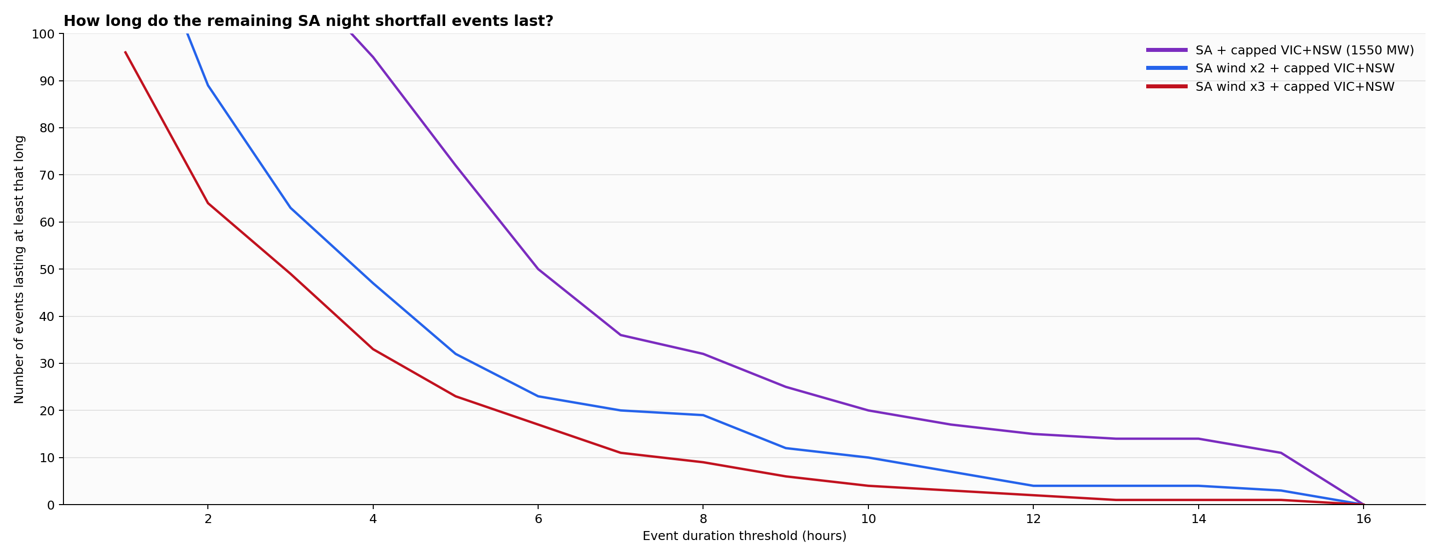 A shortfall event is then a run of consecutive night-time hours when South Australian demand is still greater than the supply available from the wind-and-interconnector scenario being tested.