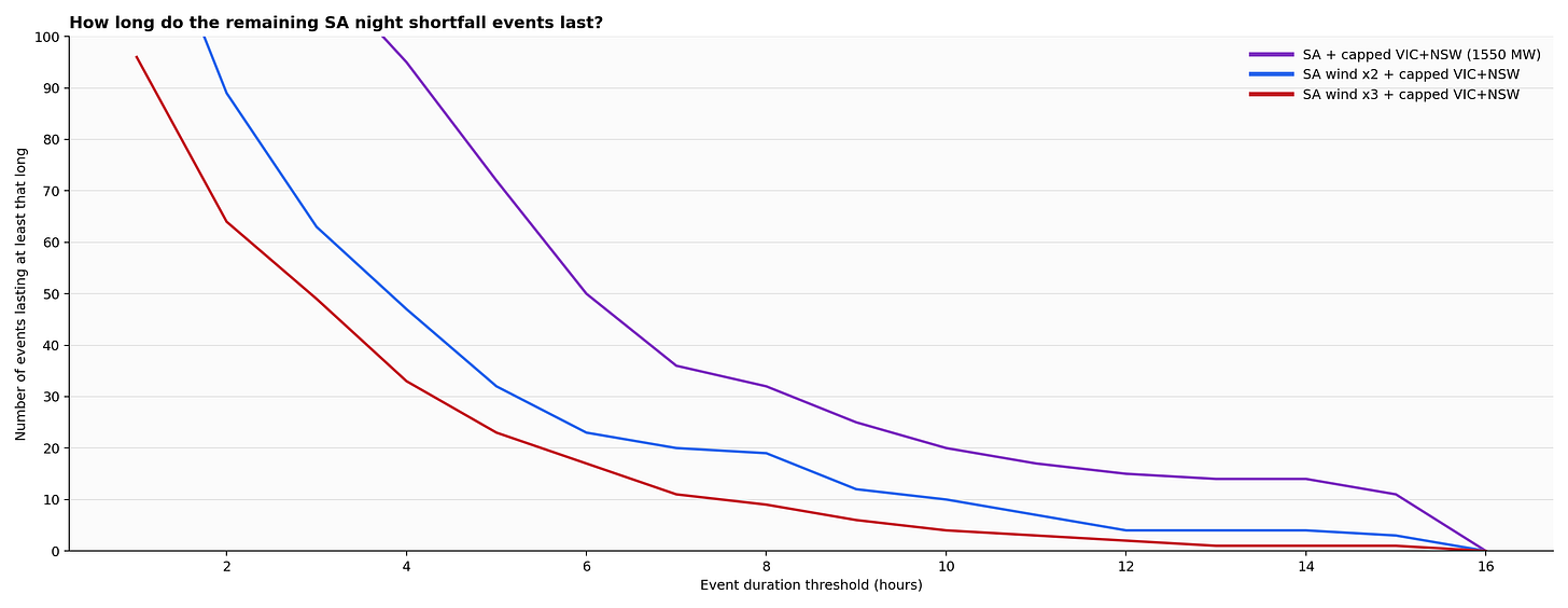 Even in 2025, under the stronger eastern-support case, there are still roughly thirty nights with eight or more consecutive hours of remaining shortfall. Double South Australian wind and that falls to roughly twenty. Triple it and it gets down toward ten.