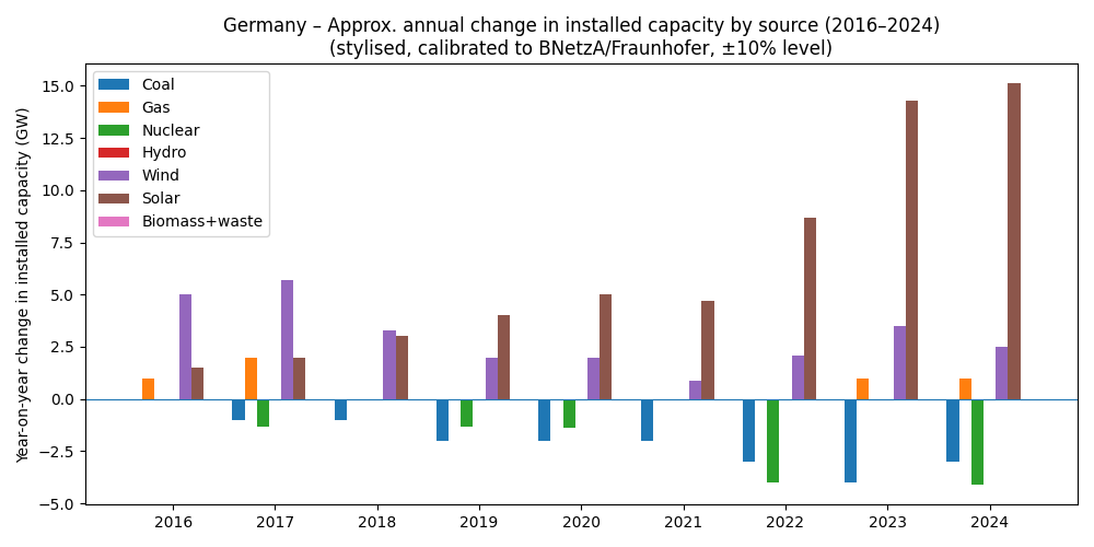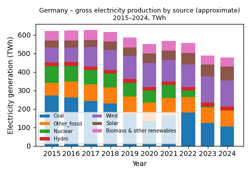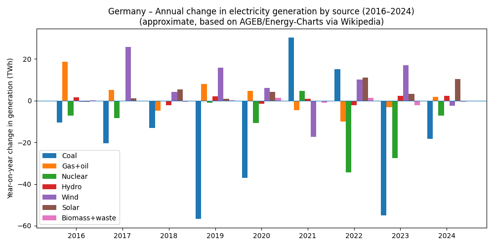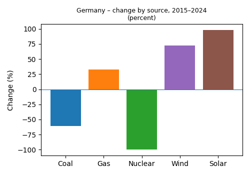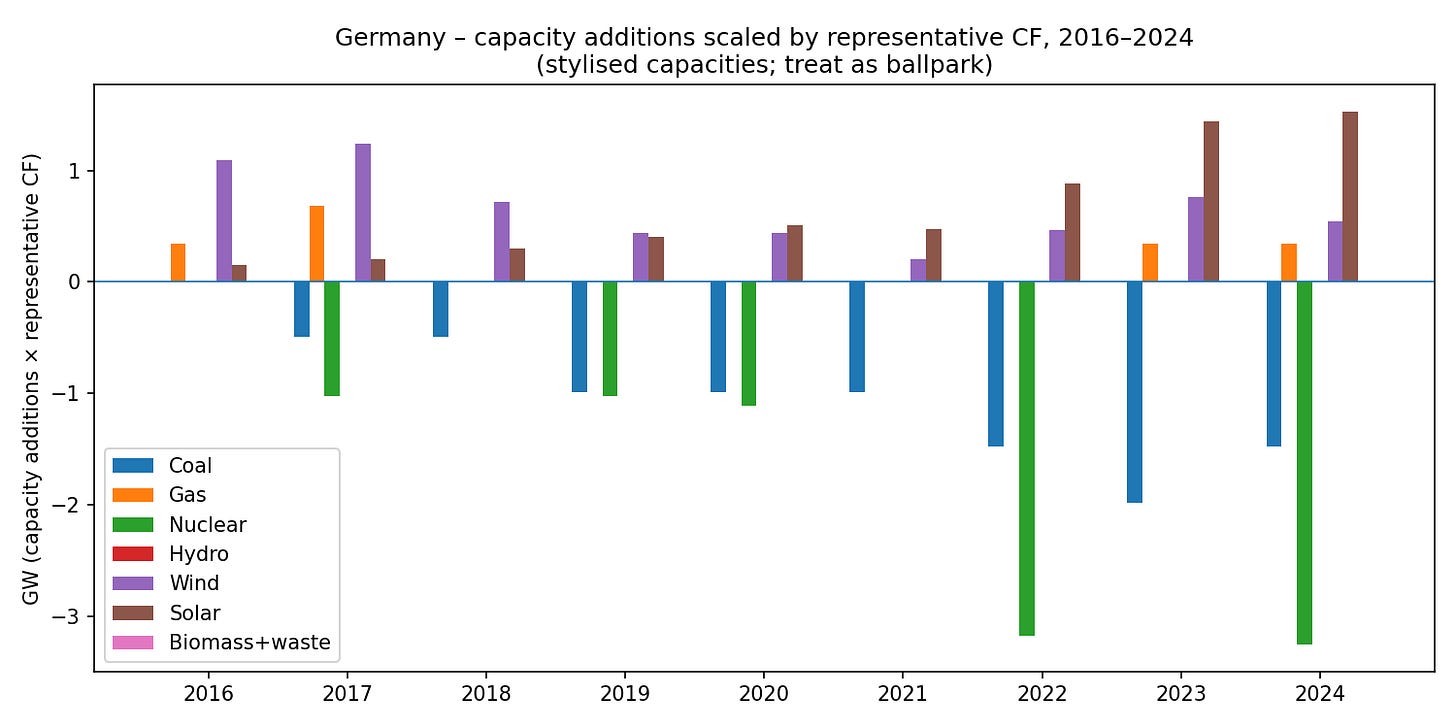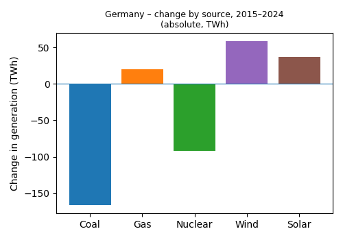 In 2015 Germany was a net exporter of about 51 TWh. By 2024 it had flipped to about 32 TWh of net imports – none of which appear in the graph above, which shows domestic generation only. In a follow-up we’ll look at these cross-border flows, because they’re central to how a high-renewables grid actually works.