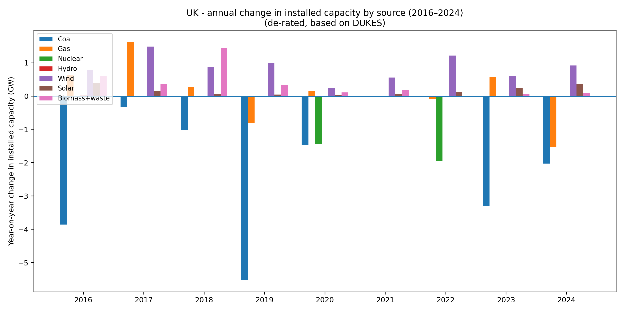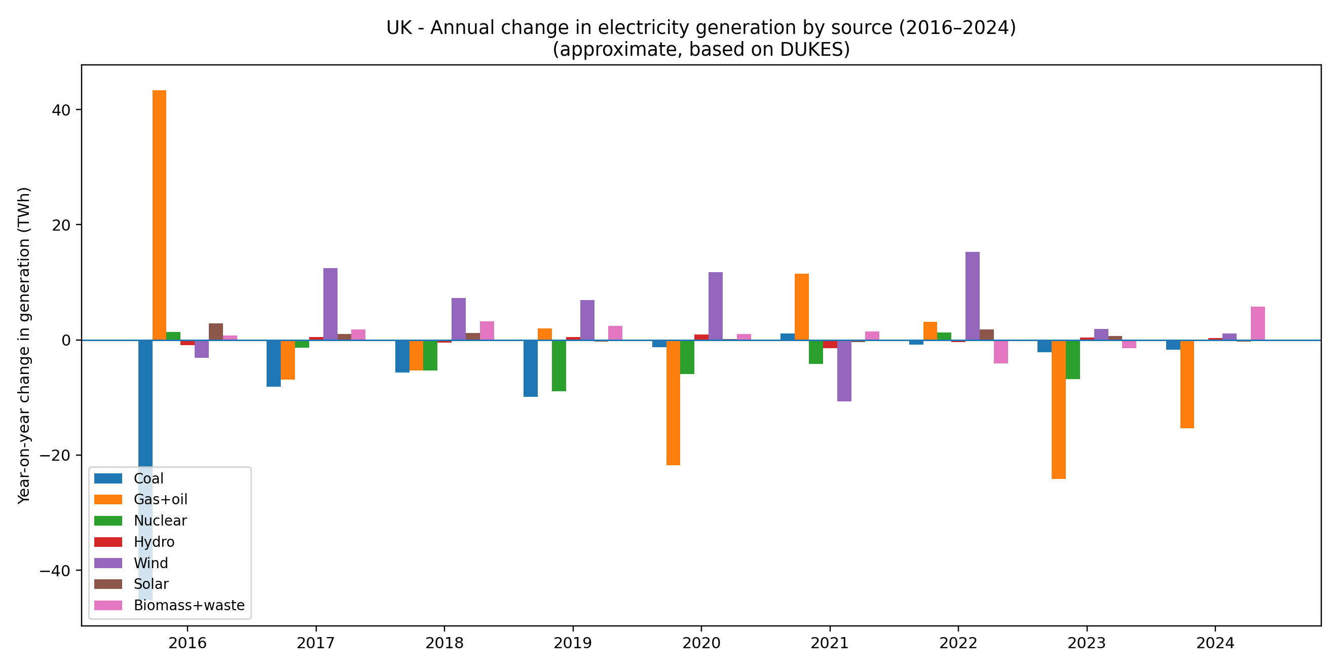 Here’s the year-on-year change in generation by source – the same data as the first graph, but shown as annual deltas: