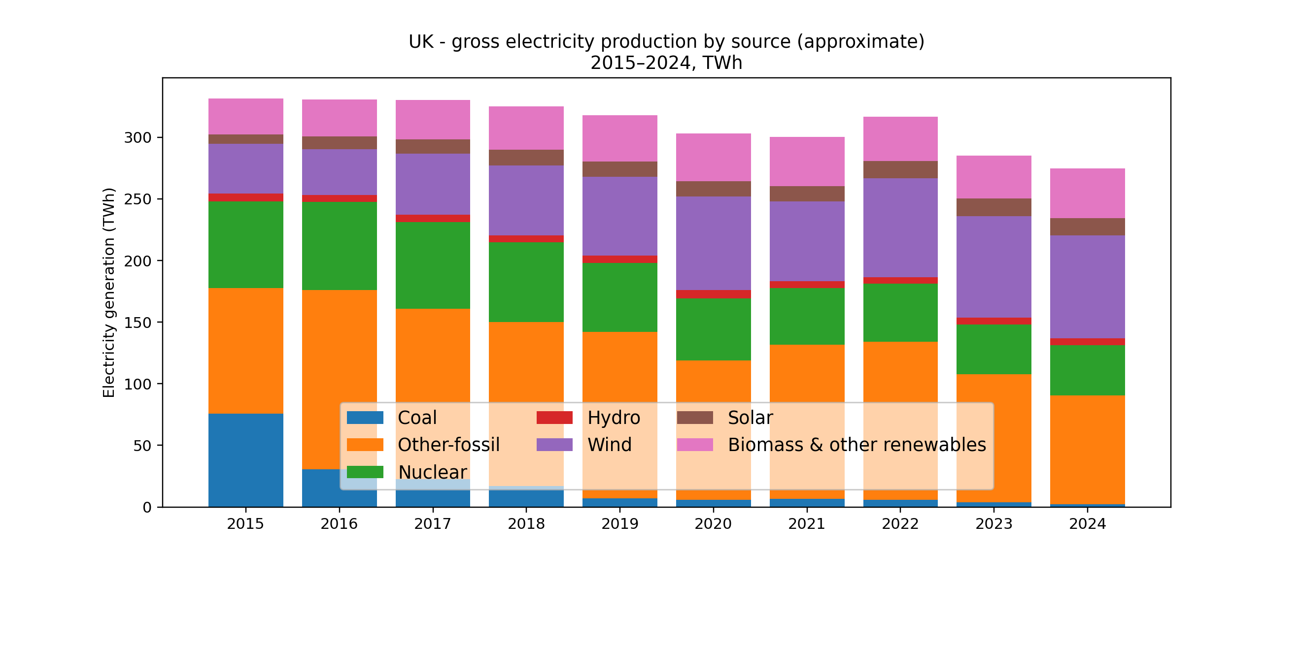 Coal collapsed, wind surged, nuclear declined, gas stayed stubbornly central, and biomass became a non-trivial chunk of “renewables”.
