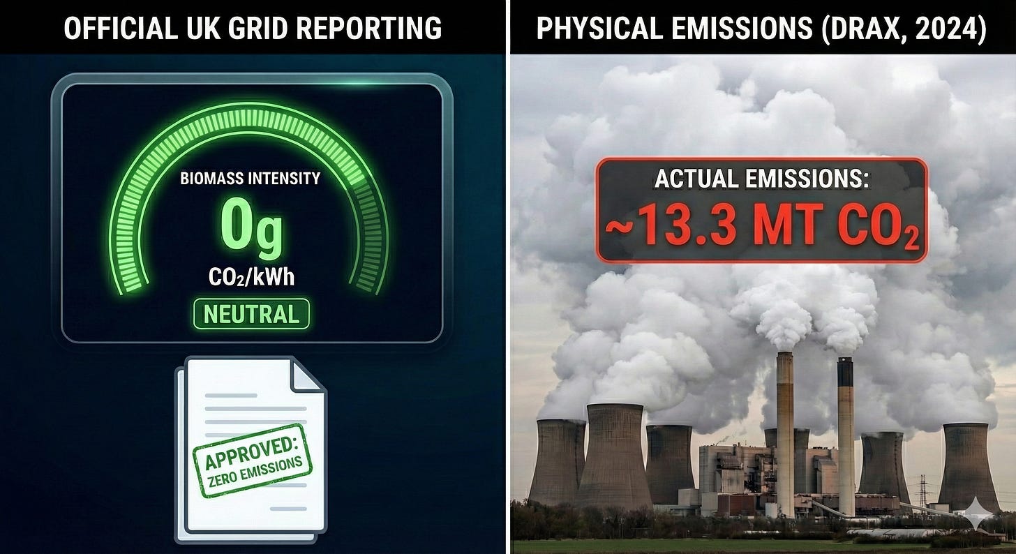 In official UK grid intensity figures, this is reported as 0g CO2/kWh, despite the physical stack emissions being higher per MWh than a coal plant.