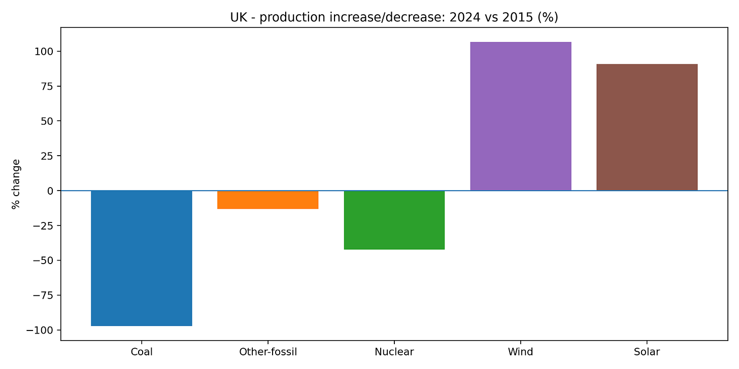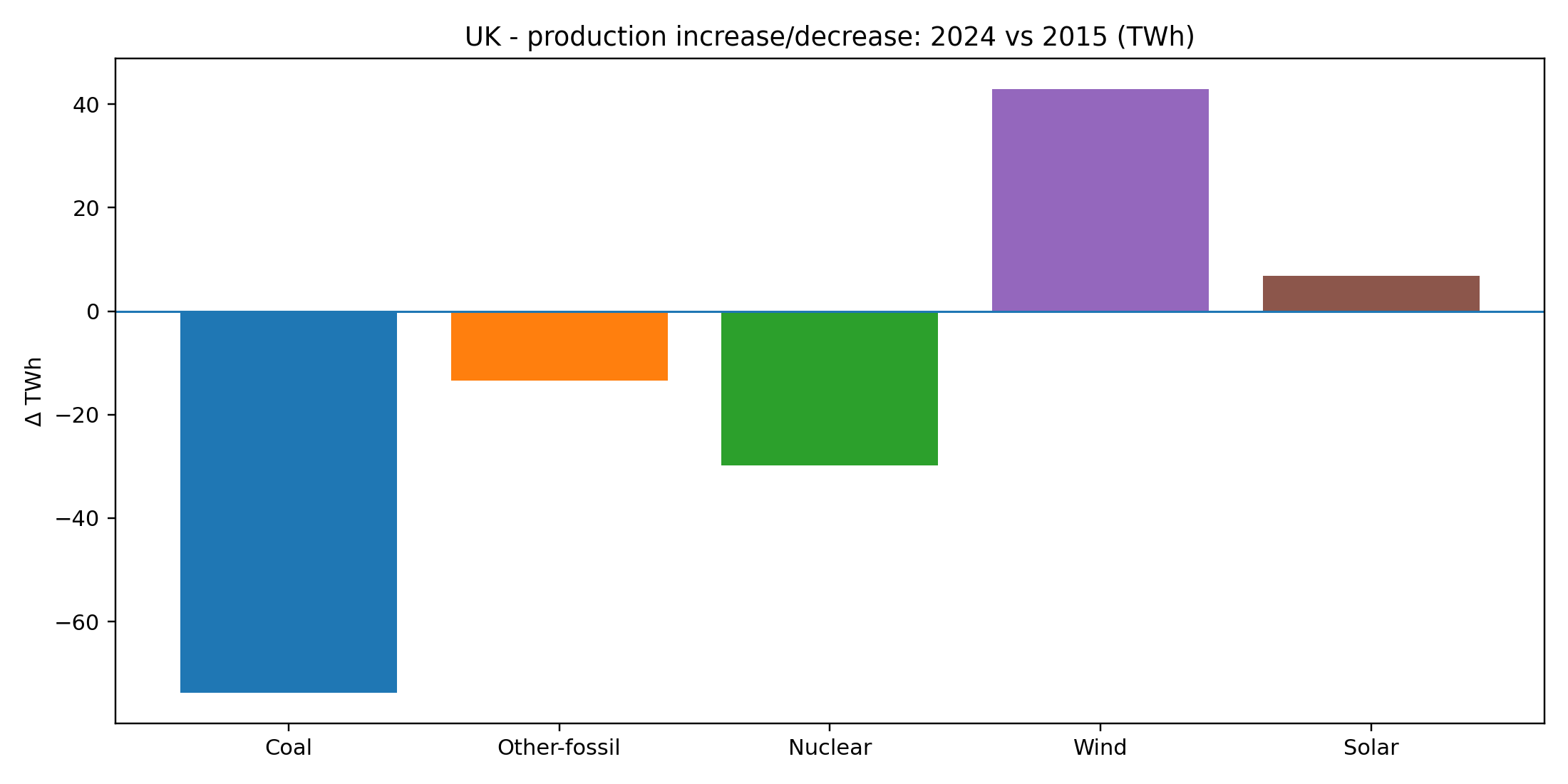 Coal: ~76 TWh (2015) → ~2 TWh (2024). That’s basically a disappearance.