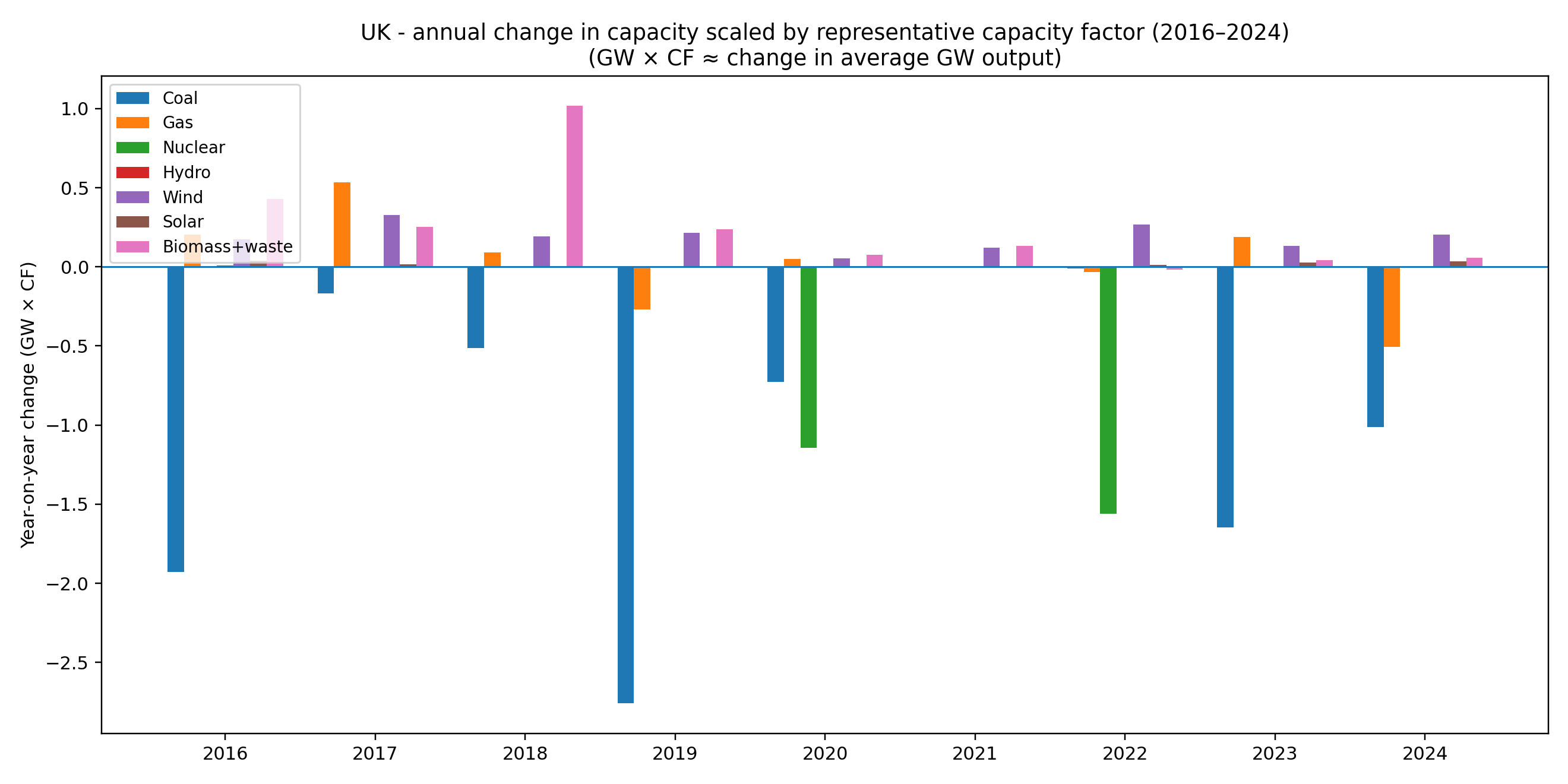 This chart takes the capacity changes and multiplies each technology by a representative capacity factor (CF). It’s a blunt tool, but a useful one.