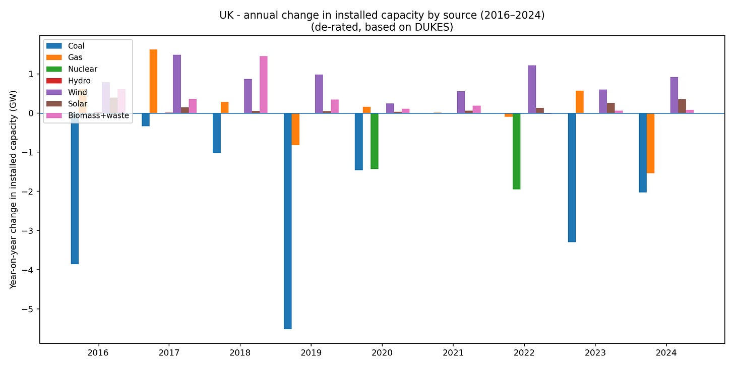 This chart is also where you start to feel the shape of the follow-up post: if you remove coal and some nuclear, then add variable renewables, the system must compensate with something that can respond quickly (gas, imports, storage, demand response, etc.).